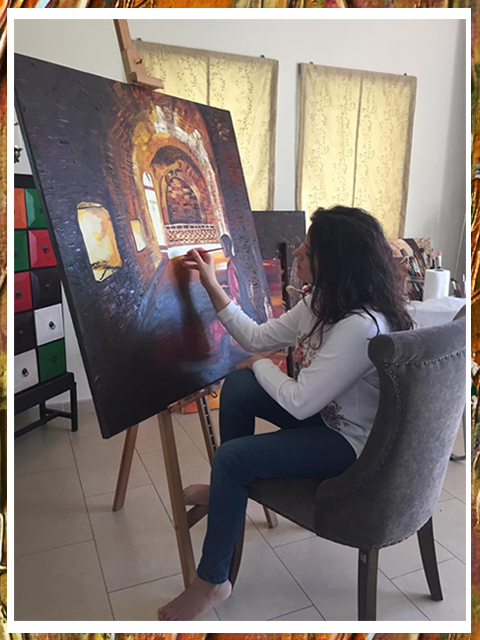 Saima works mostly with oil colours on canvas. Her work for a long span of time was inspired by the words and philosophy of the great poet RUMI. She developed an expertise in depicting the movement of the whirling dervishes, which are popularly related to the Rumi teachings. She studied the dervishes closely having spent some time with them in meditation, and reflects the deepest emotions felt during and leading to those meditative dances. She varies her colour pallet from mono tones to paintings where the whole canvas is filled with a burst of shouting colours. One of her most famous series of paintings is done in black white and gold.