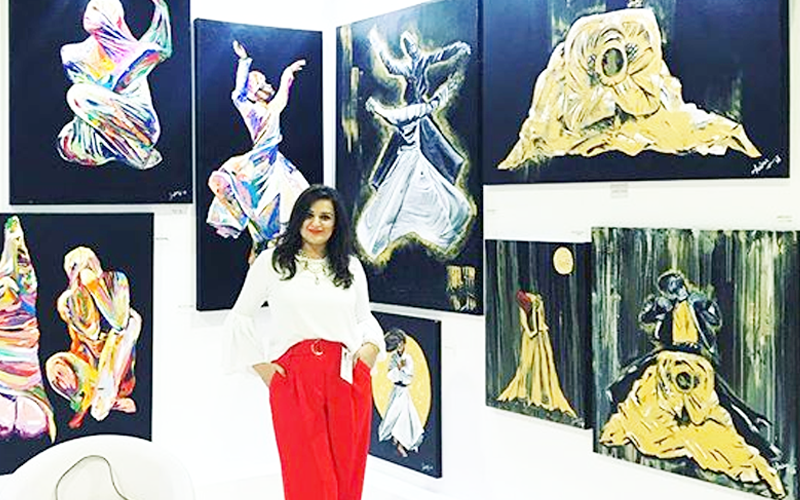 Saima works mostly with oil colours on canvas. Her work for a long span of time was inspired by the words and philosophy of the great poet RUMI. She developed an expertise in depicting the movement of the whirling dervishes, which are popularly related to the Rumi teachings. She studied the dervishes closely having spent some time with them in meditation, and reflects the deepest emotions felt during and leading to those meditative dances. She varies her colour pallet from mono tones to paintings where the whole canvas is filled with a burst of shouting colours. One of her most famous series of paintings is done in black white and gold.